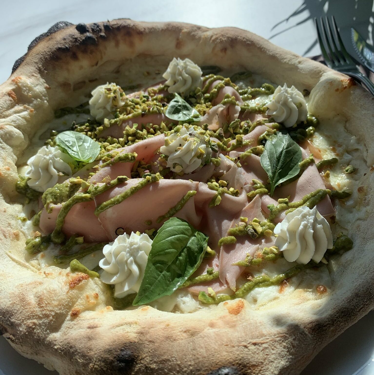 Mozzarella fior di latte, crème, jambon blanc, champignons, Parmigiano Reggiano de montagne DOP 13 mois d’affinage, crème de parmesan à la truffe.